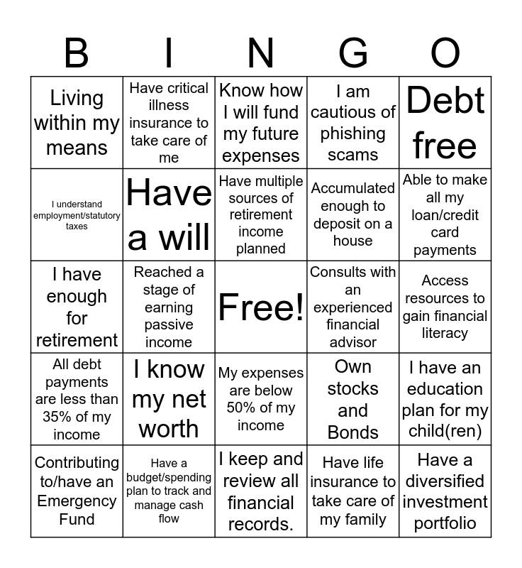 This bingo card has a free space and 24 words: I know my net worth, Have a budget/spending plan to track and manage cash flow, Have multiple sources of retirement income planned, Contributing to/have an Emergency Fund, Debt free, Living within my means, I understand employment/statutory taxes, Have critical illness insurance to take care of me, Consults with an experienced financial advisor, My expenses are below 50% of my income, Accumulated enough to deposit on a house, I have enough for retirement, Own stocks and Bonds, I have an education plan for my child(ren), Have a will, Have life insurance to take care of my family, Access resources to gain financial literacy, Know how I will fund my future expenses, Able to make all my loan/credit card payments, Reached a stage of earning passive income, Have a diversified investment portfolio, All debt payments are less than 35% of my income, I am cautious of phishing scams and I keep and review all financial records..