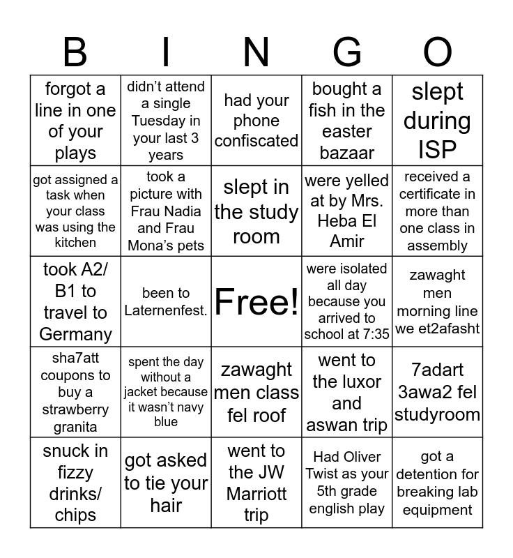 This bingo card has a free space and 24 words: spent the day without a jacket because it wasn’t navy blue, got asked to tie your hair, slept in the study room, snuck in fizzy drinks/ chips, slept during ISP, forgot a line in one of your plays, got assigned a task when your class was using the kitchen, didn’t attend a single Tuesday in your last 3 years, were isolated all day because you arrived to school at 7:35, zawaght men class fel roof, were yelled at by Mrs. Heba El Amir, took A2/ B1 to travel to Germany, went to the luxor and aswan trip, 7adart 3awa2 fel studyroom, took a picture with Frau Nadia and Frau Mona’s pets, Had Oliver Twist as your 5th grade english play, zawaght men morning line we et2afasht, had your phone confiscated, received a certificate in more than one class in assembly, been to Laternenfest., got a detention for breaking lab equipment, sha7att coupons to buy a strawberry granita, bought a fish in the easter bazaar and went to the JW Marriott trip.