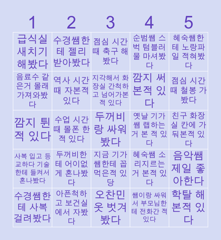 This bingo card has a free space and 24 words: 두꺼비한테 어이없게 혼나봤다, 아픈척하고 보건실에서 자봤다, 지각해서 화장실 간척하고 넘어가본적 있다, 수경쌤한테 사복 걸려봤다, 혜숙쌤한테 노랑파일 적혀봤다, 급식실 새치기 해봤다, 음료수 같은거 몰래 가져와봤다, 수경쌤한테 젤리 받아봤다, 옛날 기가쌤 랩하는거 본 적 있다, 지금 기가쌤한테 꼽 먹은적 있당, 깜지 써본적 있다, 깜지 튄적 있다, 혜숙쌤 소리지르는거 본적 있다, 음악쌤 제일 좋아한다, 역사 시간때 자본적 있다, 쌤이랑 싸워서 부모님한테 전화간 적 있다, 친구 화장실 칸에 가둬본적 있다, 점심 시간때 축구 해봤다, 점심 시간때 철봉 가봤다, 수업 시간때 몰폰 한 적 있다, 학탈 해본적 있다, 사복 입고 등교하다 기술한테 들켜서 혼나봤다, 순범쌤 스벅 텀블러물 마셔봤다 and 오찬민 옷 벗겨봤다.