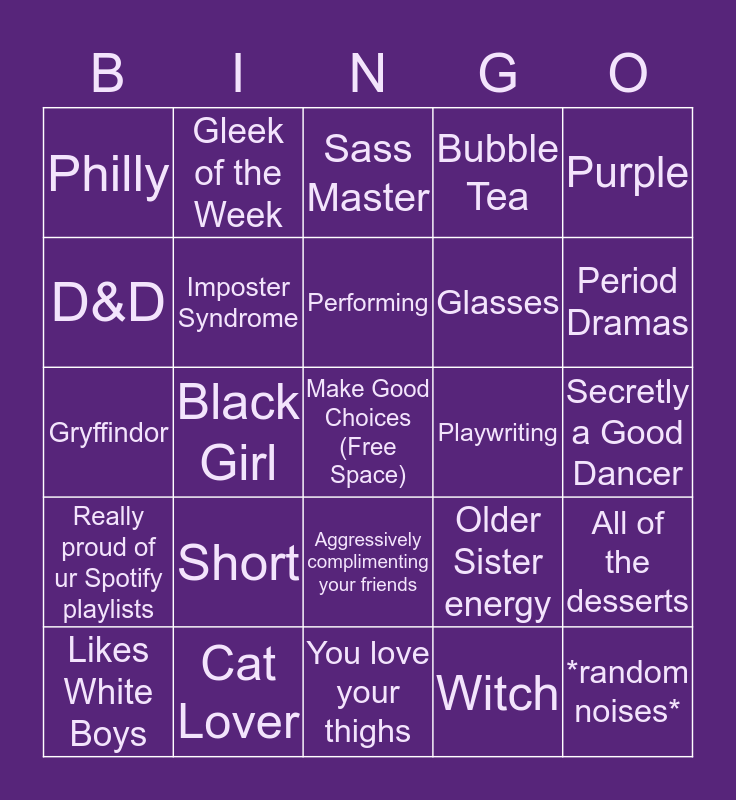 This bingo card has a free space and 24 words: Short, Cat Lover, Performing, Likes White Boys, Purple, Philly, D&D, Gleek of the Week, Playwriting, Aggressively complimenting your friends, Glasses, Gryffindor, Older Sister energy, All of the desserts, Imposter Syndrome, Witch, Secretly a Good Dancer, Sass Master, Period Dramas, Black Girl, *random noises*, Really proud of ur Spotify playlists, Bubble Tea and You love your thighs.