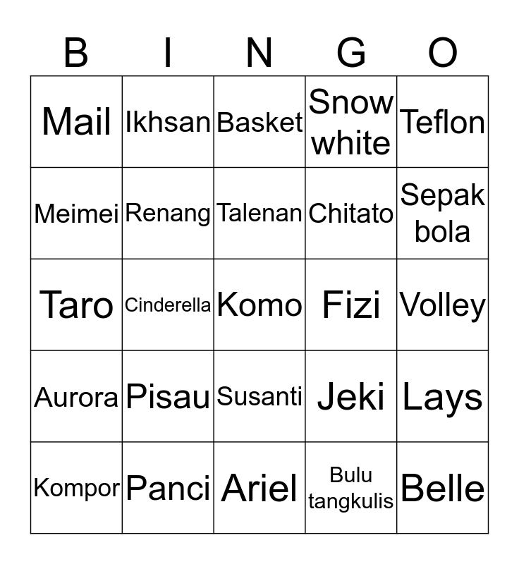 This bingo card has a free space and 24 words: Pisau, Panci, Talenan, Kompor, Teflon, Mail, Meimei, Ikhsan, Fizi, Susanti, Chitato, Taro, Jeki, Lays, Renang, Bulu tangkulis, Volley, Basket, Sepak bola, Cinderella, Belle, Aurora, Snow white and Ariel.