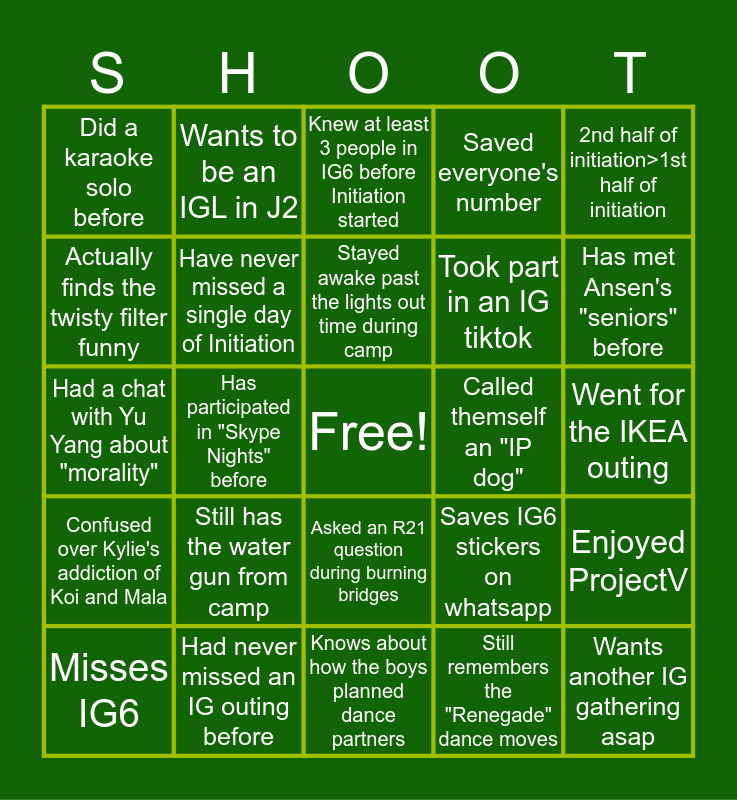 This bingo card has a free space and 24 words: Still has the water gun from camp, Had never missed an IG outing before, Stayed awake past the lights out time during camp, Misses IG6, 2nd half of initiation>1st half of initiation, Did a karaoke solo before, Actually finds the twisty filter funny, Wants to be an IGL in J2, Called themself an "IP dog", Asked an R21 question during burning bridges, Took part in an IG tiktok, Had a chat with Yu Yang about "morality", Saves IG6 stickers on whatsapp, Enjoyed ProjectV, Have never missed a single day of Initiation, Still remembers the "Renegade" dance moves, Went for the IKEA outing, Knew at least 3 people in IG6 before Initiation started, Has met Ansen's "seniors" before, Has participated in "Skype Nights" before, Wants another IG gathering asap, Confused over Kylie's addiction of Koi and Mala, Saved everyone's number and Knows about how the boys planned dance partners.