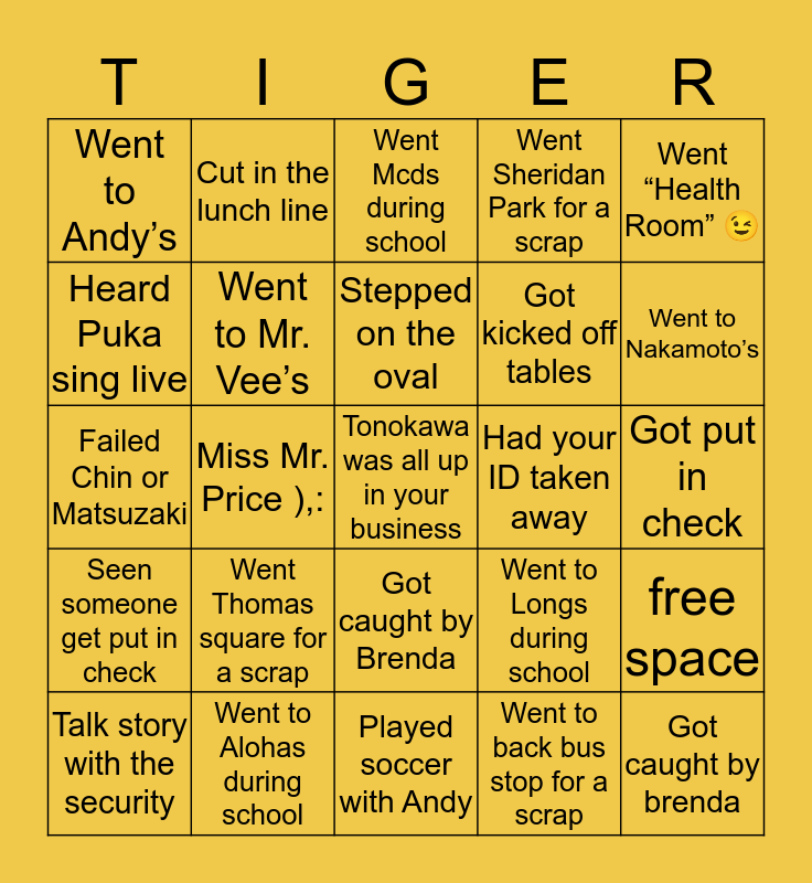 This bingo card has 26 words: Got caught by Brenda, Went to back bus stop for a scrap, Stepped on the oval, Went to Alohas during school, Went “Health Room” 😉, Went to Andy’s, Heard Puka sing live, Cut in the lunch line, Got put in check, Went to Longs during school, Got kicked off tables, Failed Chin or Matsuzaki, free space, Talk story with the security, Miss Mr. Price ),:, Failed Trinh, Went Sheridan Park for a scrap, Seen someone get put in check, Went Mcds during school, Tonokawa was all up in your business, Went to Nakamoto’s, Played soccer with Andy, Had your ID taken away, Went Thomas square for a scrap, Went to Mr. Vee’s and Got caught by brenda.