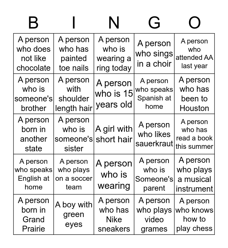 This bingo card has 25 words: A person who plays on a soccer team, A person who has Nike sneakers, A person who is 15 years old, A person born in Grand Prairie, A person who attended AA last year, A person who does not like chocolate, A person who is someone's brother, A person who has painted toe nails, A person who likes sauerkraut, A person who is wearing, A person who speaks Spanish at home, A person born in another state, A person who is Someone's parent, A person who plays a musical instrument, A person with shoulder length hair, A person who knows how to play chess, A person who has read a book this summer, A person who is wearing a ring today, A person who has been to Houston, A person who is someone's sister, A girl with short hair, A boy with green eyes, A person who speaks English at home, A person who sings in a choir and A person who plays video grames.
