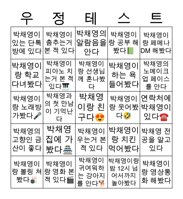 This bingo card has a free space and 24 words: 박채영 집에 가봤다🏯, 박채영이랑 영화 본 적 있다🎬, 박채영이랑 선생님께 혼나봤다, 박채영이랑 볼링 쳐 봤다🎳, 박채영이랑 페메나 DM 해봤다, 박채영이 있는 단톡방에 있다, 박채영이랑 학교 다녀봤다, 박채영이 춤추는거 본 적 있다, 박채영이랑 웃어봤다🤣, 박채영이 우는거 본 적 있다, 박채영이 하는 욕 들어봤다, 박채영이랑 노래방 가봤다🎤, 박채영이랑 치킨 먹어봤다, 박채영 전공을 알고있다, 박채영이 피아노 치는거 본 적 있다🎹, 박채영이랑 밤 12시 넘어서까지 놀아봤다, 연락처에 박채영이 있다☎️, 박채영의 알람음을 안다, 박채영의 노메이크업 페이스를 안다, 박채영과의 첫 만남이 기억난다, 박채영이랑 영상통화 해봤다, 박채영의 고향인 금산이 좋다, 박채영이랑 공부 해봤다📗 and 박채영이 귀여워하는 강아지를 안다🐕.
