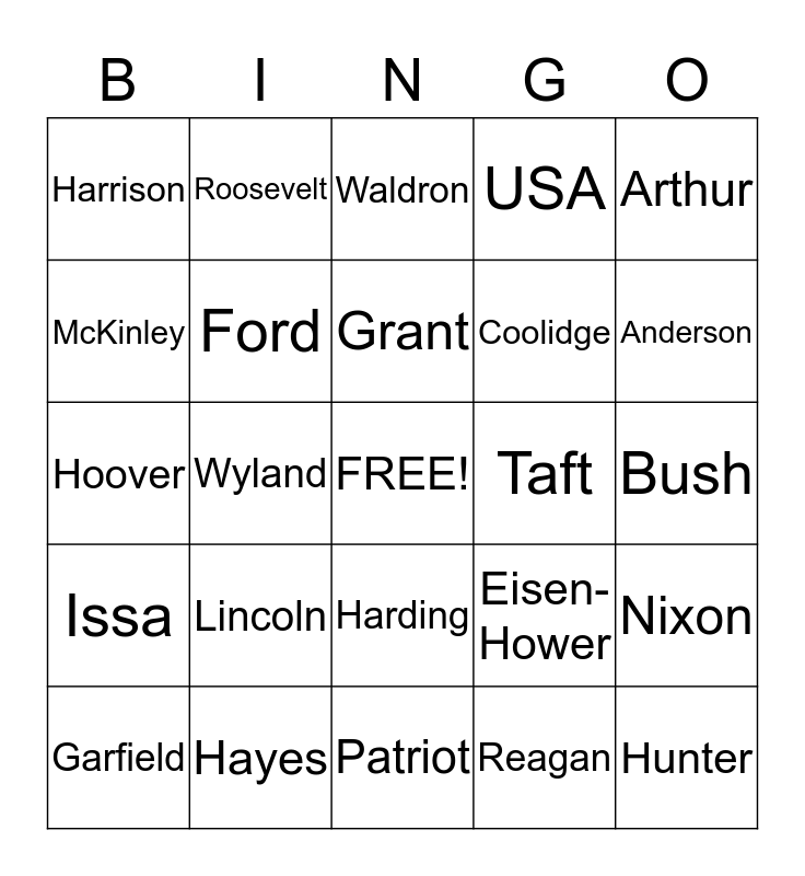 This bingo card has a free space and 24 words: Lincoln, Hayes, Grant, Garfield, Arthur, Harrison, McKinley, Roosevelt, Taft, Harding, Coolidge, Hoover, Eisen- Hower, Nixon, Ford, Reagan, Bush, Waldron, Anderson, Wyland, Hunter, Issa, USA and Patriot.
