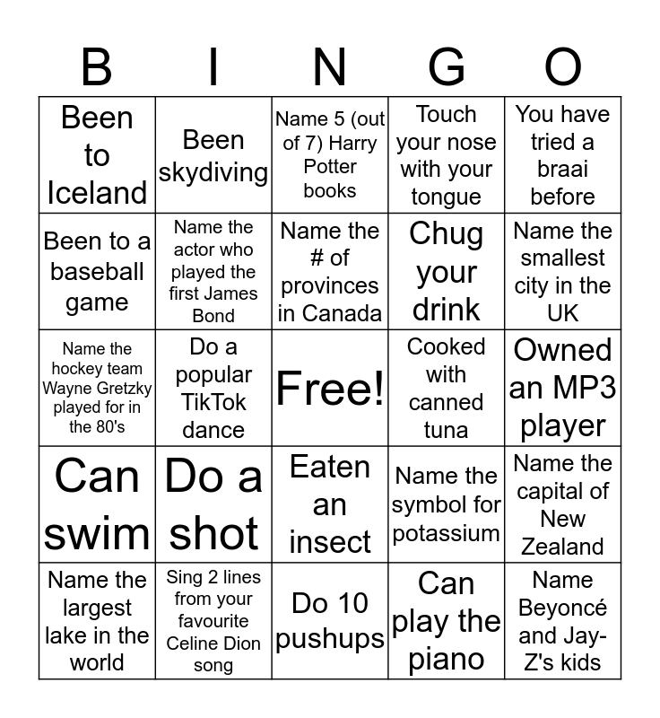 This bingo card has a free space and 24 words: Do a shot, Sing 2 lines from your favourite Celine Dion song, Name the # of provinces in Canada, Name the largest lake in the world, You have tried a braai before, Been to Iceland, Been to a baseball game, Been skydiving, Cooked with canned tuna, Eaten an insect, Chug your drink, Name the hockey team Wayne Gretzky played for in the 80's, Name the symbol for potassium, Name the capital of New Zealand, Name the actor who played the first James Bond, Can play the piano, Owned an MP3 player, Name 5 (out of 7) Harry Potter books, Name the smallest city in the UK, Do a popular TikTok dance, Name Beyoncé and Jay-Z's kids, Can swim, Touch your nose with your tongue and Do 10 pushups.