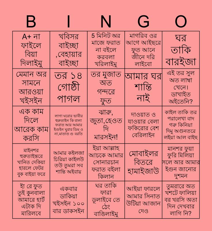 This bingo card has a free space and 24 words: আমার কইলজা চিরিয়া কাইলউ তউ তুমরা সব শান্তি অইবায়, একবার ডাকিয়া খইসইন ১০০ বার ডাকসইন, তর মুজাত অত গন্দরে ফুত, ইা রে ফুত তুই কুনবালা আমারে হার্ট এটাক দি মারিলবে, ঘর তাকি বারইজা, A+ না ফাইলে বিয়া দিলাইমু, মেমান অর সামনে আরওয়া খইসইন, খবিসর বাইচ্ছা ,বেহায়ার বাইচ্ছা, দাওয়াত ও যাওয়ার বেলা ফকিরোর বেশ বেরিলাইন, ইয়া আল্লাহ আচকে আমার সোনারচান ফরাত বইলা কিলান, আমার ঘর শান্তি নাই, এক কাম দিলে আরেক কাম করসি, মোবাইলর বিতরে হামাইজাউ, মানশর ফুয়া ফুরি মিলিয়া সলে আর আমার ইগুন জানোর দুশমন, তর ১৪ গোষ্ঠী পাগল, আইয়া ফারলে আমার সিনাত উটিয়া আজান দেও, কাইল তাকি তর পরালেখা বাদ গরু কিনিয়া দিমু অগুনতরে লইয়া আল বাইছ, 5 মিনিট অর মাজে ফরাত না বইলে করবলা খরিলাইমু, এই তর সুল অত লাম্বা খেনে। ডাখাইত অইতেনি?, লাগা ঘরোর ভাবীর হুরুতাইন কি বালা ফরাত আর আমার ইগুইন ঘুরার ডিম ও না,মাতাত গু বরতি, তুমরারে অত খশটে ফালিয়া বর খরসি অতা দিন দেখবার লাগি নি?, মাইনশর হুরুতাইন্তরে খানিত দেকিয়া হারলে ফেটর বুক বাইয়া ফরে, মাগরিব ওর আগে আইছরে ফুত আনে জীনে দরি লাইবো and ঘর তাকি ফারা ডূলাইবে তে ঠেং বাঙিলাইমু.