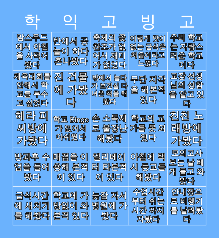 This bingo card has a free space and 24 words: 매점을 이용해 본적이 있다, 학교에 가방없이 와본적 있다, 밖에서 놀다가 보건실 다녀온 척을 해봤다, 급식시간에 새치기를 해봤다, 우리 학교는 자랑스러운 학교이다, 맘스푸드에서 아침을 사먹어봤다, 체육대회를 안해서 학교를 부수고 싶었다, 반에서 공놀이 하다 혼나봤다, 학교의 교가를 못 외웠다, 엘리베이터 타본적이 있다, 무단 지각을 해본적 있다, 헤라 피씨방에 가봤다, 아침에 택시 등교를 해봤다, 모의고사 보는 날 베개 들고 와봤다, 진 건물에 가봤다, 수업시간 부터 쉬는 시간 까지 자봤다, 친친 노래방에 가봤다, 축제의 꽃 찬조가 없어서 재미가 없었다, 교장 선생님의 성함을 알고 있다, 학교 Bingo가 없어서 아쉬웠다, 안내장으로 비행기를 날려봤다, 방과후 수업을 들어봤다, 이렇게 맛이 없는 급식은 처음이라고 느꼈다 and 늦잠 자서 병원에 가봤다.