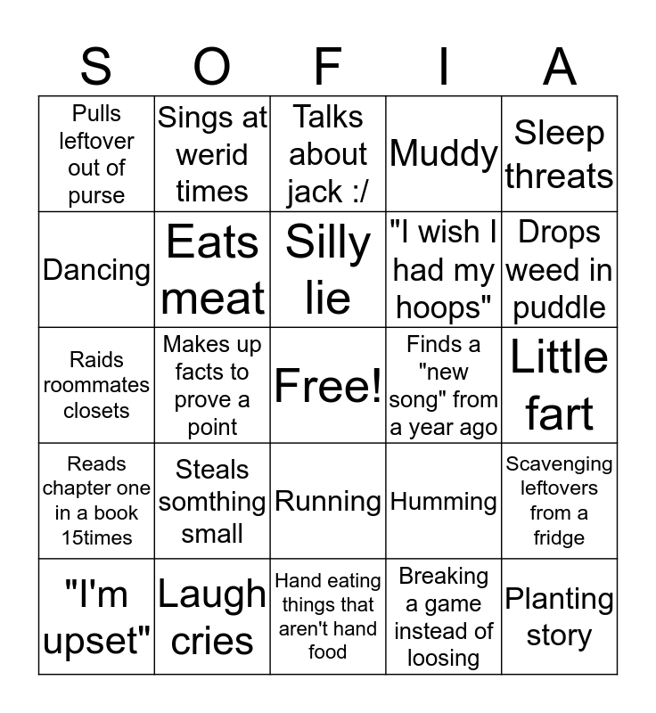 This bingo card has a free space and 24 words: Steals somthing small, Laugh cries, Silly lie, "I'm upset", Sleep threats, Pulls leftover out of purse, Dancing, Sings at werid times, Finds a "new song" from a year ago, Running, "I wish I had my hoops", Raids roommates closets, Humming, Scavenging leftovers from a fridge, Eats meat, Breaking a game instead of loosing, Little fart, Talks about jack :/, Drops weed in puddle, Makes up facts to prove a point, Planting story, Reads chapter one in a book 15times, Muddy and Hand eating things that aren't hand food.