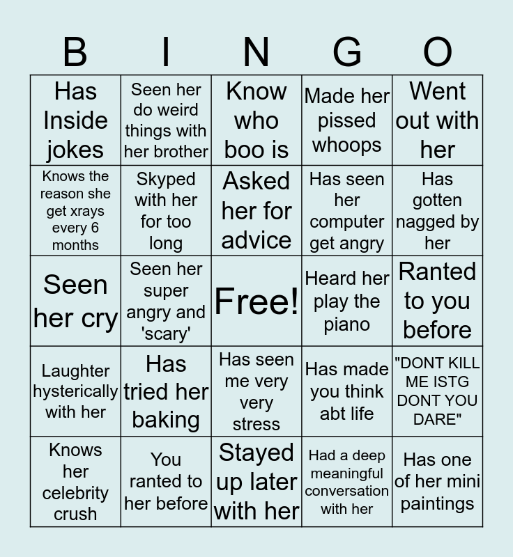 This bingo card has a free space and 24 words: Has tried her baking, You ranted to her before, Asked her for advice, Knows her celebrity crush, Went out with her, Has Inside jokes, Knows the reason she get xrays every 6 months, Seen her do weird things with her brother, Heard her play the piano, Has seen me very very stress, Has seen her computer get angry, Seen her cry, Has made you think abt life, "DONT KILL ME ISTG DONT YOU DARE", Skyped with her for too long, Had a deep meaningful conversation with her, Ranted to you before, Know who boo is, Has gotten nagged by her, Seen her super angry and 'scary', Has one of her mini paintings, Laughter hysterically with her, Made her pissed whoops and Stayed up later with her.