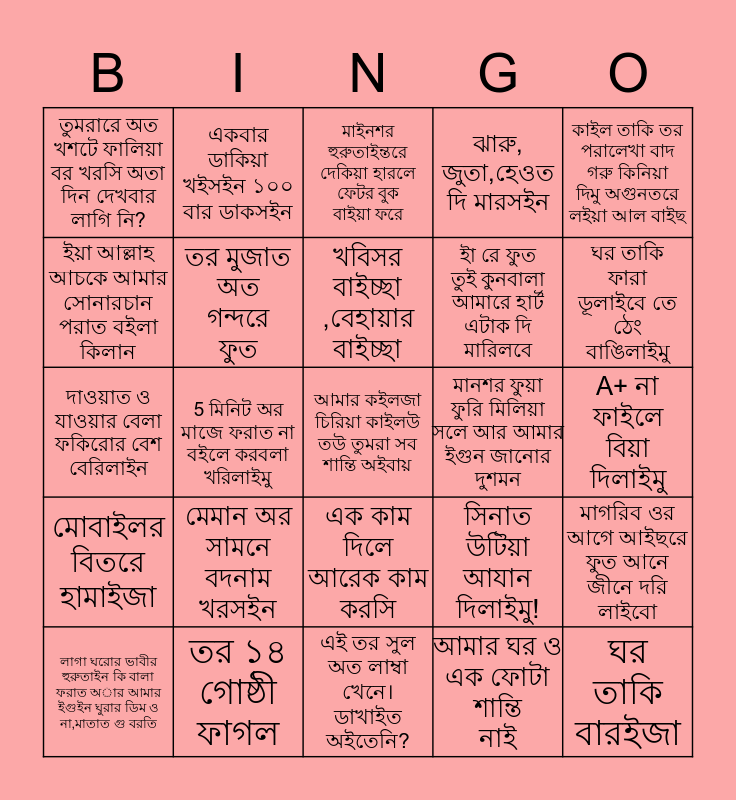 This bingo card has 25 words: মেমান অর সামনে বদনাম খরসইন, এই তর সুল অত লাম্বা খেনে। ডাখাইত অইতেনি?, খবিসর বাইচ্ছা ,বেহায়ার বাইচ্ছা, লাগা ঘরোর ভাবীর হুরুতাইন কি বালা ফরাত অার আমার ইগুইন ঘুরার ডিম ও না,মাতাত গু বরতি, কাইল তাকি তর পরালেখা বাদ গরু কিনিয়া দিমু অগুনতরে লইয়া আল বাইছ, তুমরারে অত খশটে ফালিয়া বর খরসি অতা দিন দেখবার লাগি নি?, ইয়া আল্লাহ আচকে আমার সোনারচান পরাত বইলা কিলান, একবার ডাকিয়া খইসইন ১০০ বার ডাকসইন, মানশর ফুয়া ফুরি মিলিয়া সলে আর আমার ইগুন জানোর দুশমন, এক কাম দিলে আরেক কাম করসি, ইা রে ফুত তুই কুনবালা আমারে হার্ট এটাক দি মারিলবে, দাওয়াত ও যাওয়ার বেলা ফকিরোর বেশ বেরিলাইন, সিনাত উটিয়া আযান দিলাইমু!, মাগরিব ওর আগে আইছরে ফুত আনে জীনে দরি লাইবো, তর মুজাত অত গন্দরে ফুত, ঘর তাকি বারইজা, A+ না ফাইলে বিয়া দিলাইমু, মাইনশর হুরুতাইন্তরে দেকিয়া হারলে ফেটর বুক বাইয়া ফরে, ঘর তাকি ফারা ডূলাইবে তে ঠেং বাঙিলাইমু, 5 মিনিট অর মাজে ফরাত না বইলে করবলা খরিলাইমু, আমার কইলজা চিরিয়া কাইলউ তউ তুমরা সব শান্তি অইবায়, তর ১৪ গোষ্ঠী ফাগল, মোবাইলর বিতরে হামাইজা, ঝারু, জুতা,হেওত দি মারসইন and আমার ঘর ও এক ফোটা শান্তি নাই.