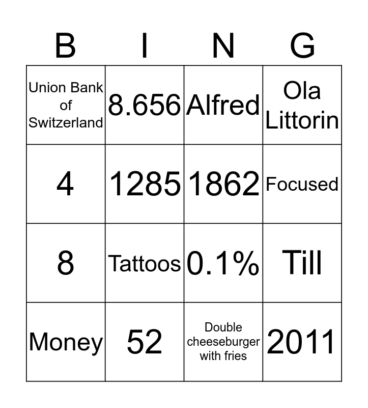 This bingo card has 22 words: 52, 1621, 8.656, 6, 1285, 1862, Union Bank of Switzerland, Alfred, 0.1%, 2011, 8, Ola Littorin, 3.5trn, Georgie & Hayley, Double cheeseburger with fries, Goldilocks and the three bears, Till, Money, Tattoos, 4, Focused and Performance Measurement and Mangement.