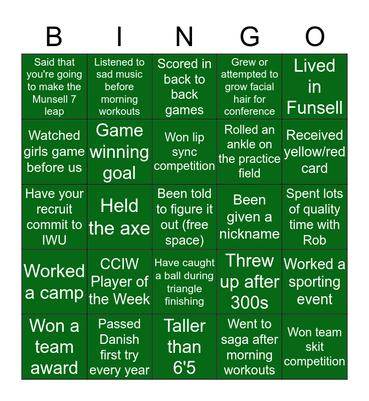 This bingo card has a free space and 24 words: CCIW Player of the Week, Passed Danish first try every year, Won lip sync competition, Won a team award, Lived in Funsell, Said that you're going to make the Munsell 7 leap, Watched girls game before us, Listened to sad music before morning workouts, Been given a nickname, Have caught a ball during triangle finishing, Rolled an ankle on the practice field, Have your recruit commit to IWU, Threw up after 300s, Worked a sporting event, Game winning goal, Went to saga after morning workouts, Spent lots of quality time with Rob, Scored in back to back games, Received yellow/red card, Held the axe, Won team skit competition, Worked a camp, Grew or attempted to grow facial hair for conference and Taller than 6'5.