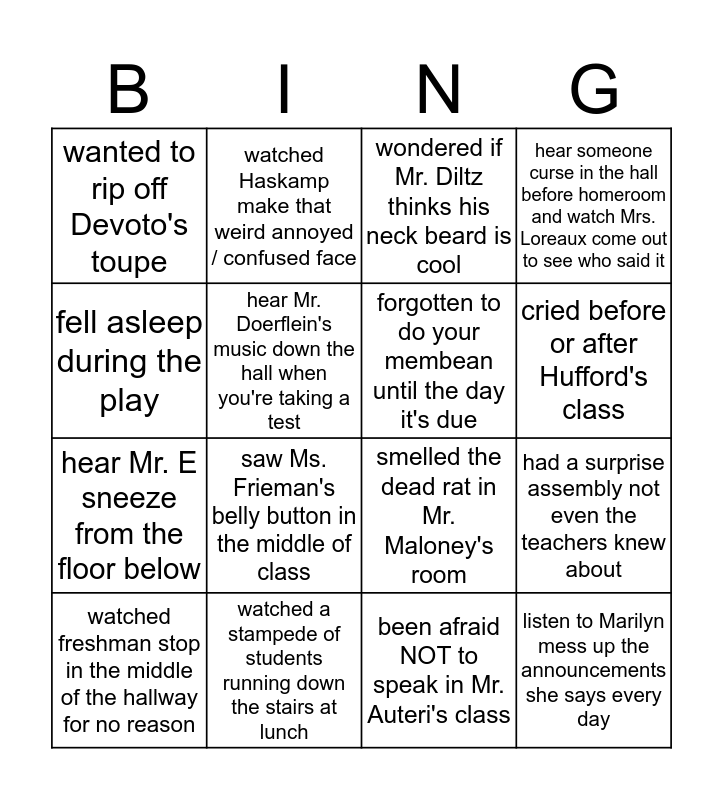 This bingo card has 16 words: watched a stampede of students running down the stairs at lunch, had a surprise assembly not even the teachers knew about, wondered if Mr. Diltz thinks his neck beard is cool, wanted to rip off Devoto's toupe, hear Mr. E sneeze from the floor below, watched Haskamp make that weird annoyed / confused face, smelled the dead rat in Mr. Maloney's room, been afraid NOT to speak in Mr. Auteri's class, fell asleep during the play, hear Mr. Doerflein's music down the hall when you're taking a test, watched freshman stop in the middle of the hallway for no reason, hear someone curse in the hall before homeroom and watch Mrs. Loreaux come out to see who said it, saw Ms. Frieman's belly button in the middle of class, cried before or after Hufford's class, forgotten to do your membean until the day it's due and listen to Marilyn mess up the announcements she says every day.