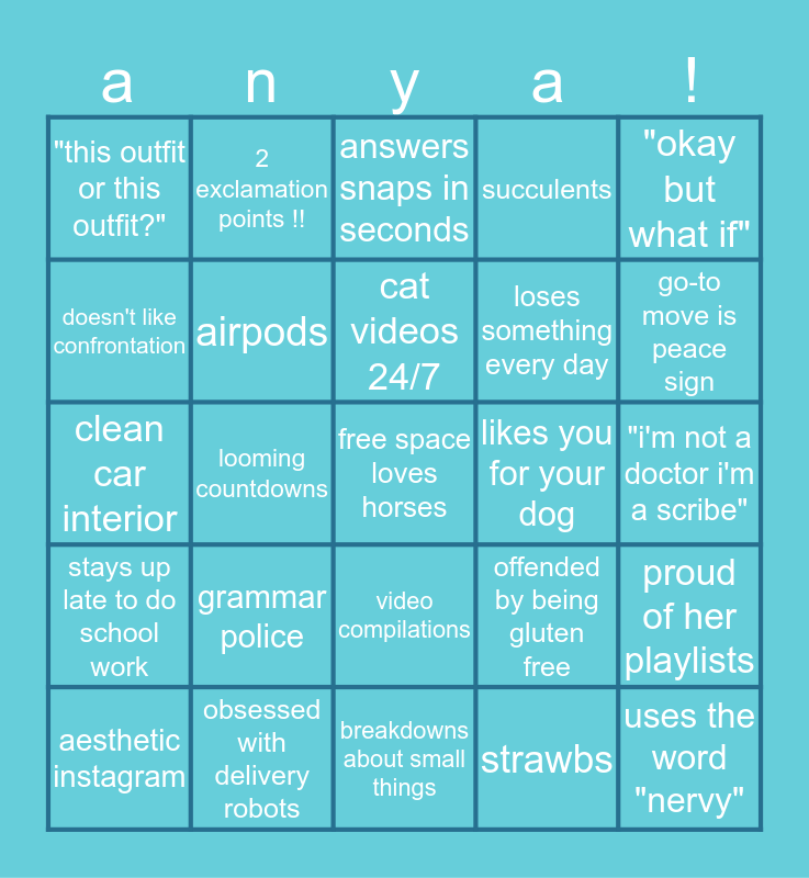 This bingo card has a free space and 24 words: aesthetic instagram, grammar police, cat videos 24/7, strawbs, "okay but what if", "this outfit or this outfit?", 2 exclamation points !!, answers snaps in seconds, likes you for your dog, "i'm not a doctor i'm a scribe", clean car interior, airpods, offended by being gluten free, proud of her playlists, doesn't like confrontation, obsessed with delivery robots, breakdowns about small things, succulents, go-to move is peace sign, stays up late to do school work, looming countdowns, video compilations, loses something every day and uses the word "nervy".