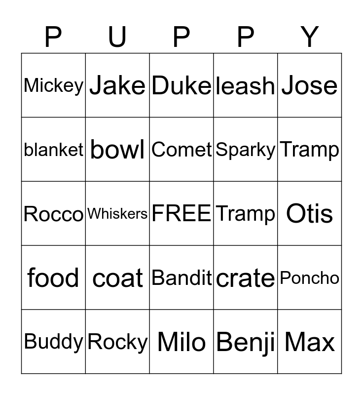 This bingo card has a free space and 24 words: coat, Rocky, Comet, Buddy, Jose, Mickey, blanket, Jake, Tramp, Bandit, Sparky, Rocco, crate, Poncho, bowl, Benji, Otis, Duke, Tramp, Whiskers, Max, food, leash and Milo.