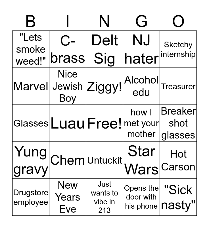 This bingo card has a free space and 24 words: Chem, New Years Eve, Ziggy!, Drugstore employee, Sketchy internship, "Lets smoke weed!", Marvel, C-brass, how I met your mother, Untuckit, Alcohol edu, Glasses, Star Wars, Hot Carson, Nice Jewish Boy, Opens the door with his phone, Breaker shot glasses, Delt Sig, Treasurer, Luau, "Sick nasty", Yung gravy, NJ hater and Just wants to vibe in 213.