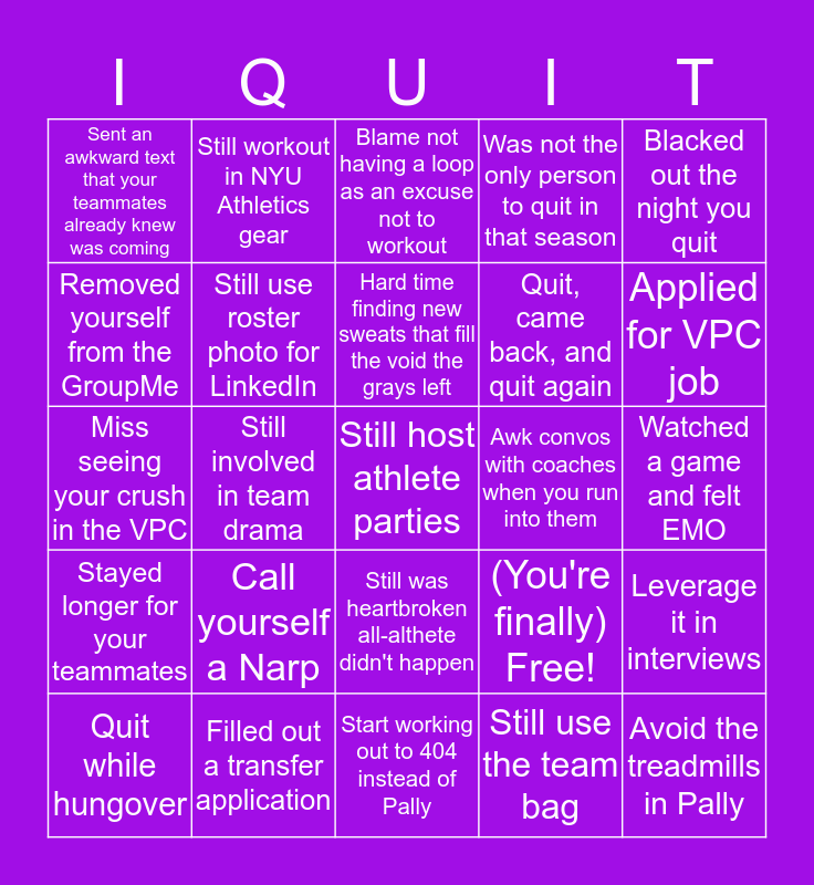 This bingo card has 25 words: Call yourself a Narp, Start working out to 404 instead of Pally, Hard time finding new sweats that fill the void the grays left, Quit while hungover, Blacked out the night you quit, Sent an awkward text that your teammates already knew was coming, Removed yourself from the GroupMe, Still workout in NYU Athletics gear, Awk convos with coaches when you run into them, Still was heartbroken all-althete didn't happen, Quit, came back, and quit again, Miss seeing your crush in the VPC, (You're finally) Free!, Leverage it in interviews, Still use roster photo for LinkedIn, Avoid the treadmills in Pally, Watched a game and felt EMO, Blame not having a loop as an excuse not to workout, Applied for VPC job, Still involved in team drama, Still host athlete parties, Filled out a transfer application, Stayed longer for your teammates, Was not the only person to quit in that season and Still use the team bag.