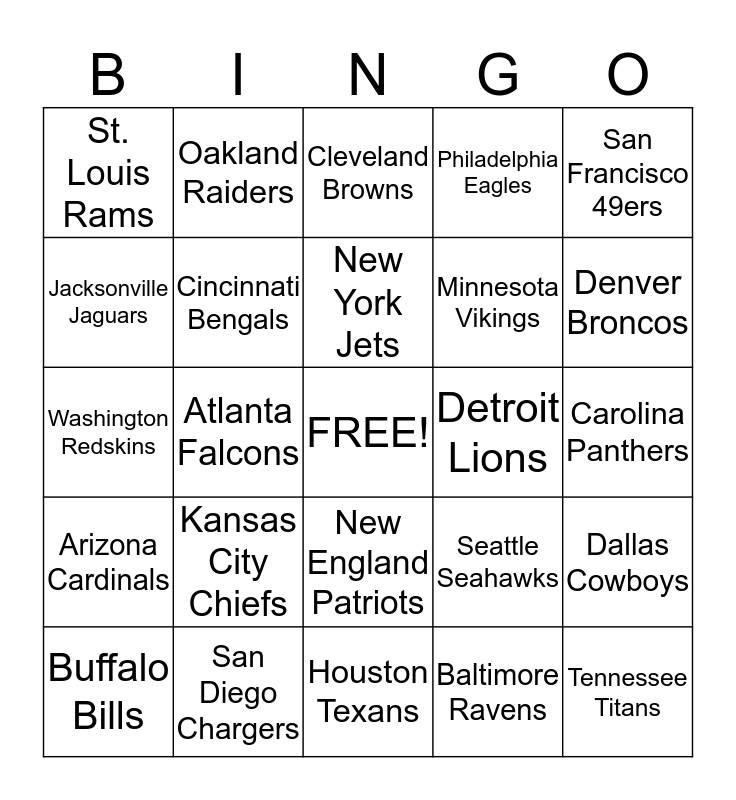 This bingo card has a free space and 24 words: Kansas City Chiefs, San Diego Chargers, New York Jets, Buffalo Bills, San Francisco 49ers, St. Louis Rams, Jacksonville Jaguars, Oakland Raiders, Detroit Lions, New England Patriots, Minnesota Vikings, Washington Redskins, Seattle Seahawks, Dallas Cowboys, Cincinnati Bengals, Baltimore Ravens, Carolina Panthers, Cleveland Browns, Denver Broncos, Atlanta Falcons, Tennessee Titans, Arizona Cardinals, Philadelphia Eagles and Houston Texans.