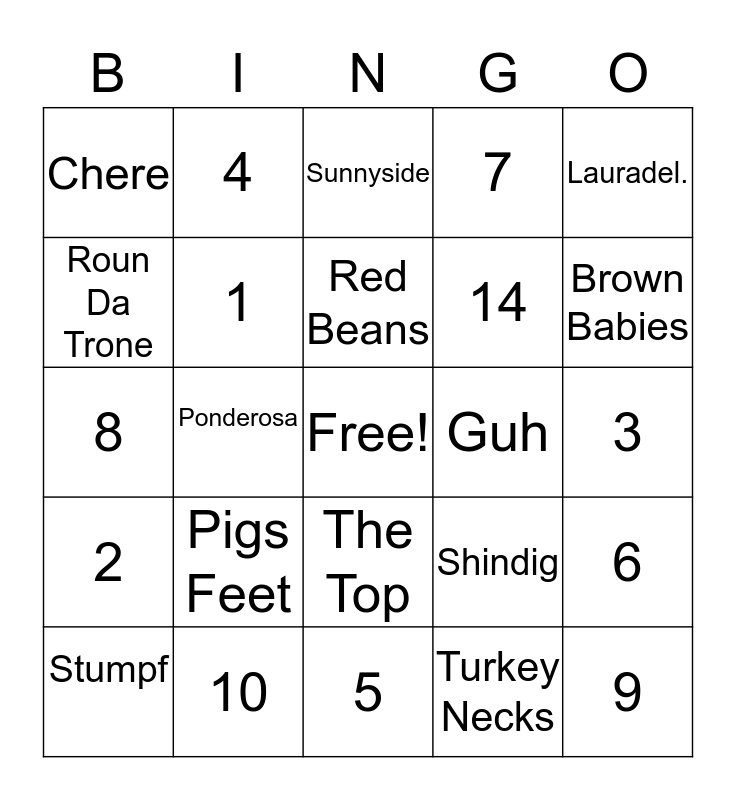 This bingo card has a free space and 24 words: Pigs Feet, 10, Red Beans, Stumpf, Lauradel., Chere, Roun Da Trone, 4, Guh, The Top, 14, 8, Shindig, 6, 1, Turkey Necks, 3, Sunnyside, Brown Babies, Ponderosa, 9, 2, 7 and 5.