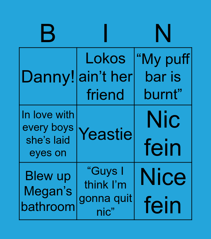 This bingo card has a free space and 10 words: “Guys I think I’m gonna quit nic”, “My puff bar is burnt”, Danny!, Nice fein, In love with every boys she’s laid eyes on, Blew up Megan’s bathroom, Lokos ain’t her friend, Made 2018, Nic fein and Lokos ain’t her friend.