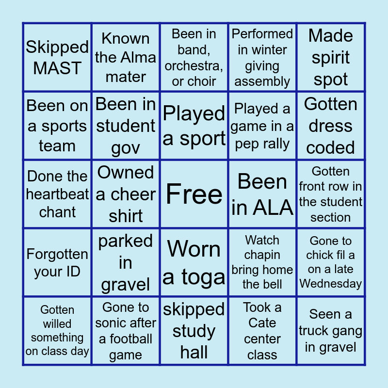This bingo card has a free space and 24 words: parked in gravel, Gone to sonic after a football game, Played a sport, Gotten willed something on class day, Made spirit spot, Skipped MAST, Been on a sports team, Known the Alma mater, Been in ALA, Worn a toga, Played a game in a pep rally, Done the heartbeat chant, Watch chapin bring home the bell, Gone to chick fil a on a late Wednesday, Been in student gov, Took a Cate center class, Gotten front row in the student section, Been in band, orchestra, or choir, Gotten dress coded, Owned a cheer shirt, Seen a truck gang in gravel, Forgotten your ID, Performed in winter giving assembly and skipped study hall.