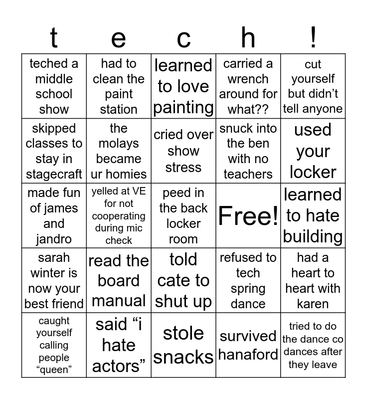 This bingo card has a free space and 24 words: read the board manual, said “i hate actors”, cried over show stress, caught yourself calling people “queen”, cut yourself but didn’t tell anyone, teched a middle school show, skipped classes to stay in stagecraft, had to clean the paint station, Free!, told cate to shut up, snuck into the ben with no teachers, made fun of james and jandro, refused to tech spring dance, had a heart to heart with karen, the molays became ur homies, survived hanaford, learned to hate building, learned to love painting, used your locker, yelled at VE for not cooperating during mic check, tried to do the dance co dances after they leave, sarah winter is now your best friend, carried a wrench around for what?? and stole snacks.