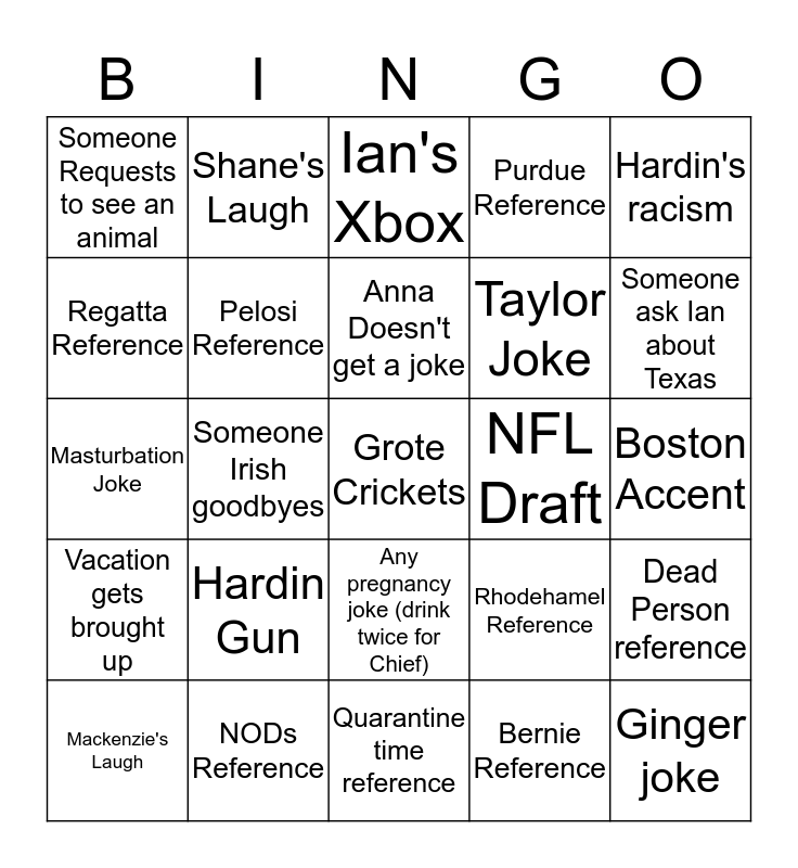 This bingo card has a free space and 24 words: Hardin Gun, NODs Reference, Anna Doesn't get a joke, Mackenzie's Laugh, Hardin's racism, Someone Requests to see an animal, Regatta Reference, Shane's Laugh, NFL Draft, Any pregnancy joke (drink twice for Chief), Taylor Joke, Masturbation Joke, Rhodehamel Reference, Dead Person reference, Pelosi Reference, Bernie Reference, Boston Accent, Ian's Xbox, Someone ask Ian about Texas, Someone Irish goodbyes, Ginger joke, Vacation gets brought up, Purdue Reference and Quarantine time reference.