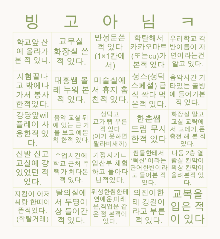 This bingo card has a free space and 24 words: 수업시간에 학교 근처 주택가 쳐다본적 있다., 탈의실에서 두명이상 들어간적 있다., 미술실에서 휴지 훔친적 있다., 지킴이 아저씨랑 한따이 뜬적있다. (학탈거래), 우리학교 각반이름이 자연이라는건 알고 있다., 학교앞 산에 올라가본 적 있다., 시험끝나고 밖에나가서 봉사한적있다., 교무실 화장실 쓴적 있다., 한춘쌤 드립 무시한적 있다, 가정시간 임산부 체험 하고 돌아다닌적있다., 성스(성덕스폐셜) 급식 싹다 먹은적 있다., 강당앞wil플레이 사용한적 있다., 쌤들한테서 ‘혁신’ 이라는 단어한번이라도 들어본 적 있다., 나동 2층 열람실 칸막이 책상 칸막이 올려본적 있다., 대홍쌤 몰래 누워 본적 있다., 의진이한테 강길이라고 부른적 있다., 화장실 말고 교실 교탁에서 고데기,폰충전 해 본 적 있다., 반성문쓴적 있다 (1×1칸에서), 음악시간 기타있는 골방에 들어가본적 있다., 음악 교실 뒤에 있는 큰 거울 보고 예쁜척 한적 있다., 교복을 입은 적이 있다, 신발 신고 교실에 걍 있었던 적 있다., 학탈해서 카카오마트(또는cu)가본적 있다 and 위성한쌤한테 연애운,미래운,직업운 같은 점 본적이 있다..
