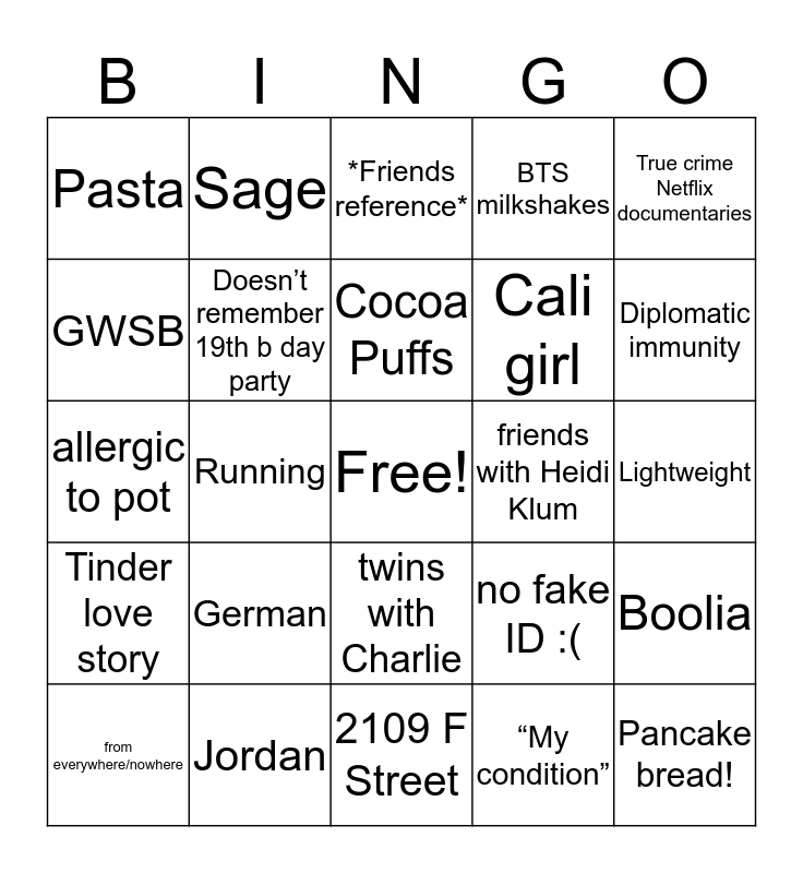 This bingo card has a free space and 24 words: German, Jordan, Cocoa Puffs, from everywhere/nowhere, True crime Netflix documentaries, Pasta, GWSB, Sage, friends with Heidi Klum, twins with Charlie, Cali girl, allergic to pot, no fake ID :(, Boolia, Doesn’t remember 19th b day party, “My condition”, Lightweight, *Friends reference*, Diplomatic immunity, Running, Pancake bread!, Tinder love story, BTS milkshakes and 2109 F Street.