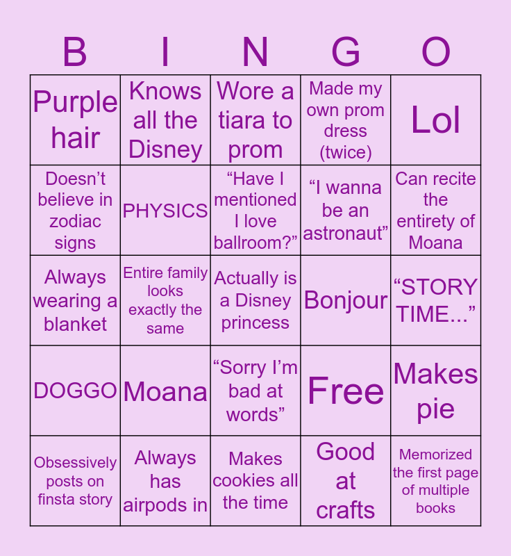 This bingo card has 25 words: Moana, Makes cookies all the time, “Have I mentioned I love ballroom?”, Obsessively posts on finsta story, Lol, Purple hair, Doesn’t believe in zodiac signs, Knows all the Disney, Bonjour, “Sorry I’m bad at words”, “I wanna be an astronaut”, Always wearing a blanket, Free, Makes pie, PHYSICS, Memorized the first page of multiple books, “STORY TIME...”, Wore a tiara to prom, Can recite the entirety of Moana, Entire family looks exactly the same, Actually is a Disney princess, Always has airpods in, DOGGO, Made my own prom dress (twice) and Good at crafts.