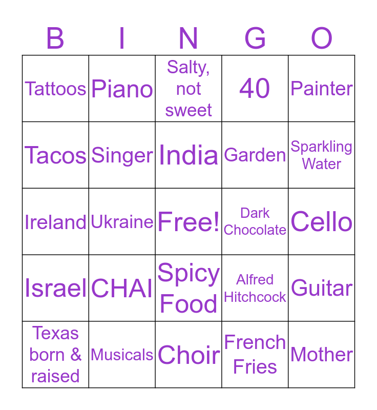This bingo card has a free space and 24 words: CHAI, Musicals, India, Texas born & raised, Painter, Tattoos, Tacos, Piano, Dark Chocolate, Spicy Food, Garden, Ireland, Alfred Hitchcock, Guitar, Singer, French Fries, Cello, Salty, not sweet, Sparkling Water, Ukraine, Mother, Israel, 40 and Choir.