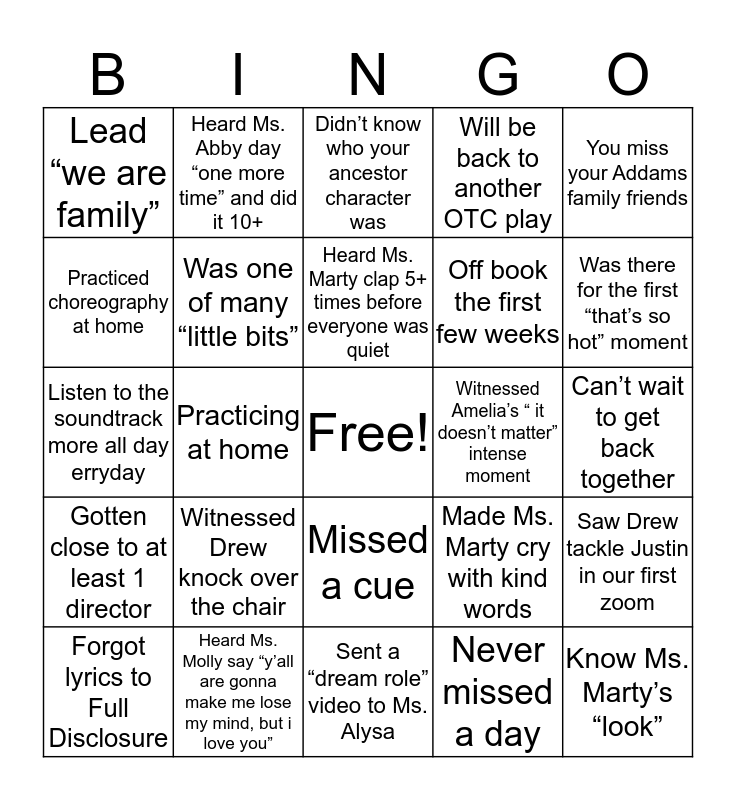 This bingo card has a free space and 24 words: Witnessed Drew knock over the chair, Heard Ms. Molly say “y’all are gonna make me lose my mind, but i love you”, Heard Ms. Marty clap 5+ times before everyone was quiet, Forgot lyrics to Full Disclosure, You miss your Addams family friends, Lead “we are family”, Practiced choreography at home, Heard Ms. Abby day “one more time” and did it 10+, Witnessed Amelia’s “ it doesn’t matter” intense moment, Missed a cue, Off book the first few weeks, Listen to the soundtrack more all day erryday, Made Ms. Marty cry with kind words, Saw Drew tackle Justin in our first zoom, Was one of many “little bits”, Never missed a day, Can’t wait to get back together, Didn’t know who your ancestor character was, Was there for the first “that’s so hot” moment, Practicing at home, Know Ms. Marty’s “look”, Gotten close to at least 1 director, Will be back to another OTC play and Sent a “dream role” video to Ms. Alysa.