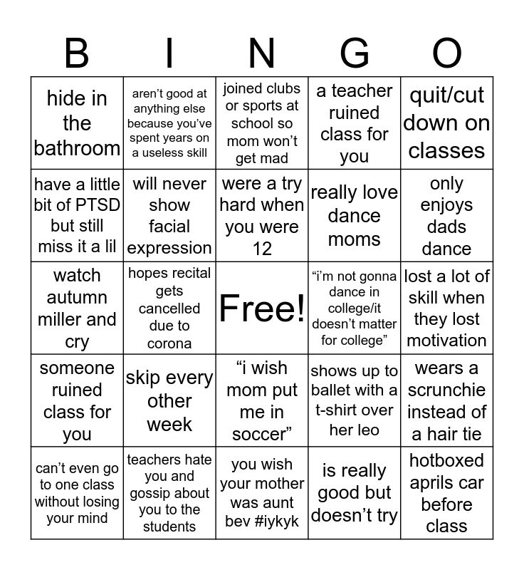 This bingo card has a free space and 24 words: skip every other week, teachers hate you and gossip about you to the students, were a try hard when you were 12, can’t even go to one class without losing your mind, quit/cut down on classes, hide in the bathroom, have a little bit of PTSD but still miss it a lil, aren’t good at anything else because you’ve spent years on a useless skill, “i’m not gonna dance in college/it doesn’t matter for college”, “i wish mom put me in soccer”, really love dance moms, watch autumn miller and cry, shows up to ballet with a t-shirt over her leo, wears a scrunchie instead of a hair tie, will never show facial expression, is really good but doesn’t try, lost a lot of skill when they lost motivation, joined clubs or sports at school so mom won’t get mad, only enjoys dads dance, hopes recital gets cancelled due to corona, hotboxed aprils car before class, someone ruined class for you, a teacher ruined class for you and you wish your mother was aunt bev #iykyk.