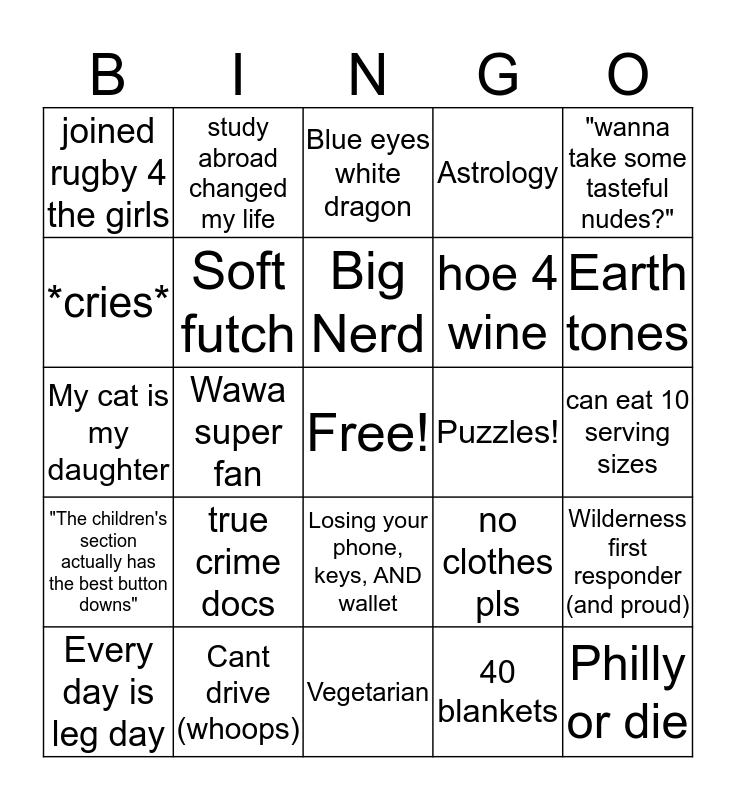 This bingo card has a free space and 24 words: true crime docs, Cant drive (whoops), Big Nerd, Every day is leg day, "wanna take some tasteful nudes?", joined rugby 4 the girls, *cries*, study abroad changed my life, Puzzles!, Losing your phone, keys, AND wallet, hoe 4 wine, My cat is my daughter, no clothes pls, Wilderness first responder (and proud), Soft futch, 40 blankets, can eat 10 serving sizes, Blue eyes white dragon, Earth tones, Wawa super fan, Philly or die, "The children's section actually has the best button downs", Astrology and Vegetarian.