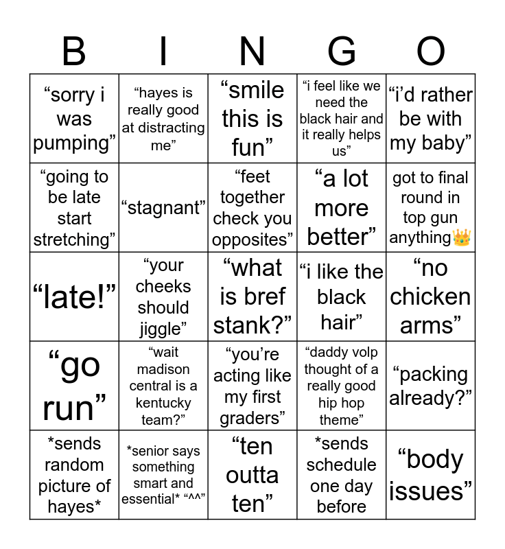 This bingo card has 25 words: “wait madison central is a kentucky team?”, “ten outta ten”, “feet together check you opposites”, *sends random picture of hayes*, “i’d rather be with my baby”, “sorry i was pumping”, “going to be late start stretching”, “hayes is really good at distracting me”, “i like the black hair”, “you’re acting like my first graders”, “a lot more better”, “late!”, “daddy volp thought of a really good hip hop theme”, “packing already?”, “stagnant”, “body issues”, “no chicken arms”, “smile this is fun”, got to final round in top gun anything👑, “your cheeks should jiggle”, “what is bref stank?”, *senior says something smart and essential* “^^”, “go run”, “i feel like we need the black hair and it really helps us” and *sends schedule one day before.