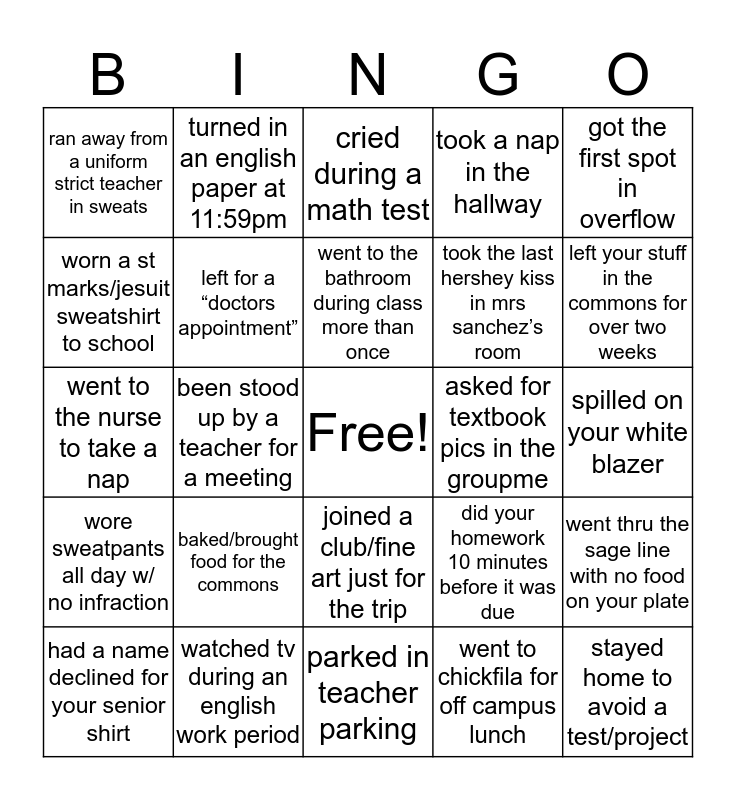 This bingo card has a free space and 24 words: had a name declined for your senior shirt, baked/brought food for the commons, went to the bathroom during class more than once, went to chickfila for off campus lunch, got the first spot in overflow, ran away from a uniform strict teacher in sweats, turned in an english paper at 11:59pm, cried during a math test, asked for textbook pics in the groupme, spilled on your white blazer, went to the nurse to take a nap, left for a “doctors appointment”, did your homework 10 minutes before it was due, went thru the sage line with no food on your plate, worn a st marks/jesuit sweatshirt to school, watched tv during an english work period, parked in teacher parking, took a nap in the hallway, left your stuff in the commons for over two weeks, wore sweatpants all day w/ no infraction, been stood up by a teacher for a meeting, joined a club/fine art just for the trip, took the last hershey kiss in mrs sanchez’s room and stayed home to avoid a test/project.