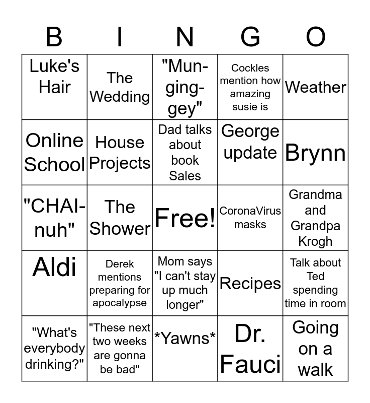 This bingo card has a free space and 24 words: Derek mentions preparing for apocalypse, "These next two weeks are gonna be bad", Dad talks about book Sales, "What's everybody drinking?", Weather, Luke's Hair, Online School, The Wedding, CoronaVirus masks, Mom says "I can't stay up much longer", George update, "CHAI-nuh", Recipes, Talk about Ted spending time in room, House Projects, Dr. Fauci, Grandma and Grandpa Krogh, "Mun-ging-gey", Brynn, The Shower, Going on a walk, Aldi, Cockles mention how amazing susie is and *Yawns*.