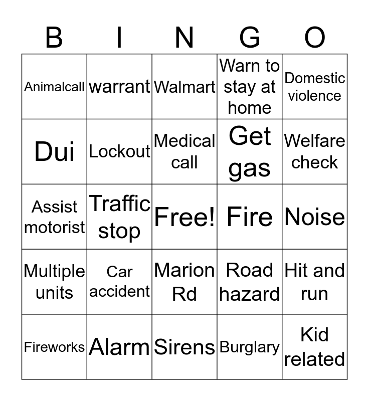 This bingo card has a free space and 24 words: Car accident, Alarm, Medical call, Fireworks, Domestic violence, Animalcall, Dui, warrant, Fire, Marion Rd, Get gas, Assist motorist, Road hazard, Hit and run, Lockout, Burglary, Noise, Walmart, Welfare check, Traffic stop, Kid related, Multiple units, Warn to stay at home and Sirens.