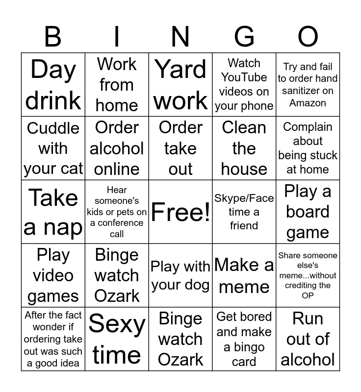This bingo card has a free space and 25 words: Binge watch Ozark, Binge watch Ozark, Order take out, After the fact wonder if ordering take out was such a good idea, Try and fail to order hand sanitizer on Amazon, Day drink, Cuddle with your cat, Work from home, Skype/Face time a friend, Play with your dog, Clean the house, Take a nap, Make a meme, Share someone else's meme...without crediting the OP, Order alcohol online, Go for a run, walk, or hike, Play a board game, Yard work, Complain about being stuck at home, Hear someone's kids or pets on a conference call, Run out of alcohol, Sexy time, Play video games, Watch YouTube videos on your phone and Get bored and make a bingo card.