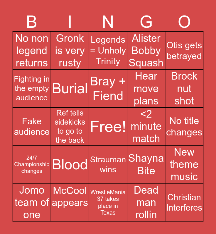 This bingo card has a free space and 24 words: Blood, McCool appears, Bray + Fiend, Jomo team of one, Otis gets betrayed, No non legend returns, Fighting in the empty audience, Gronk is very rusty, <2 minute match, Strauman wins, Hear move plans, Fake audience, Shayna Bite, New theme music, Burial, Dead man rollin, No title changes, Legends = Unholy Trinity, Brock nut shot, Ref tells sidekicks to go to the back, Christian Interferes, 24/7 Championship changes, Alister Bobby Squash and WrestleMania 37 takes place in Texas.