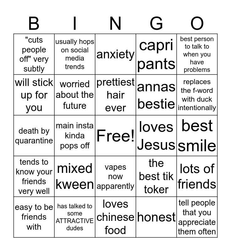 This bingo card has a free space and 24 words: mixed kween, has talked to some ATTRACTIVE dudes, prettiest hair ever, easy to be friends with, best person to talk to when you have problems, "cuts people off" very subtly, will stick up for you, usually hops on social media trends, loves Jesus, vapes now apparently, annas bestie, death by quarantine, the best tik toker, lots of friends, worried about the future, honest, best smile, anxiety, replaces the f-word with duck intentionally, main insta kinda pops off, tell people that you appreciate them often, tends to know your friends very well, capri pants and loves chinese food.