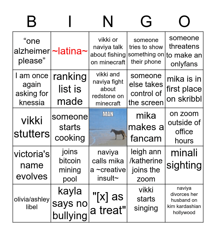 This bingo card has a free space and 42 words: yan walks in and asks fia a question in chinese, vikki and naviya fight about redstone on minecraft, pen island, joins bitcoin mining pool, vikki starts singing, minali sighting, naviya divorces her husband on kim kardashian hollywood, minecraft rescue mission, vikki or naviya talk about fishing on minecraft, naviya calls mika a ~creative insult~, on zoom outside of office hours, mika is in first place on skribbl, someone starts cooking, someone threatens to make an onlyfans, vikki screams so loud the audio cuts out, leigh ann /katherine joins the zoom, anyone besides vigi sings, vikki stutters, someone cries on zoom, ~latina~, I am once again asking for knessia, someone falls asleep on zoom, mika is high, “one alzheimer please”, embroidery, love is a rebellious bird, someone else takes control of the screen, change of location, mika misspells something, soup on the side, periodt., victoria's name evolves, ranking list is made, "[x] as a treat", someone rage quits zoom, olivia/ashley libel, kayla says no bullying, mika makes a fancam, unbenevolent ruler mutes someone, mika talks about tulane, someone tries to show something on their phone and "i am once again asking you to [x]".