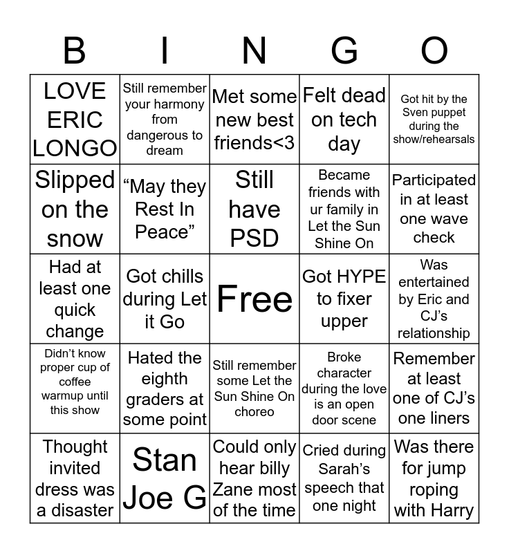 This bingo card has a free space and 24 words: Hated the eighth graders at some point, Stan Joe G, Still have PSD, Thought invited dress was a disaster, Got hit by the Sven puppet during the show/rehearsals, LOVE ERIC LONGO, Slipped on the snow, Still remember your harmony from dangerous to dream, Got HYPE to fixer upper, Still remember some Let the Sun Shine On choreo, Became friends with ur family in Let the Sun Shine On, Had at least one quick change, Broke character during the love is an open door scene, Remember at least one of CJ’s one liners, “May they Rest In Peace”, Cried during Sarah’s speech that one night, Was entertained by Eric and CJ’s relationship, Met some new best friends<3, Participated in at least one wave check, Got chills during Let it Go, Was there for jump roping with Harry, Didn’t know proper cup of coffee warmup until this show, Felt dead on tech day and Could only hear billy Zane most of the time.