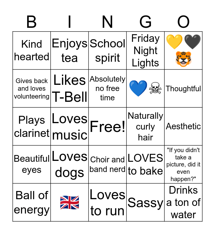 This bingo card has a free space and 24 words: Loves dogs, 🇬🇧, Absolutely no free time, Ball of energy, 💛🖤🐯, Kind hearted, Gives back and loves volunteering, Enjoys tea, Naturally curly hair, Choir and band nerd, 💙☠, Plays clarinet, LOVES to bake, "If you didn't take a picture, did it even happen?", Likes T-Bell, Sassy, Aesthetic, School spirit, Thoughtful, Loves music, Drinks a ton of water, Beautiful eyes, Friday Night Lights and Loves to run.