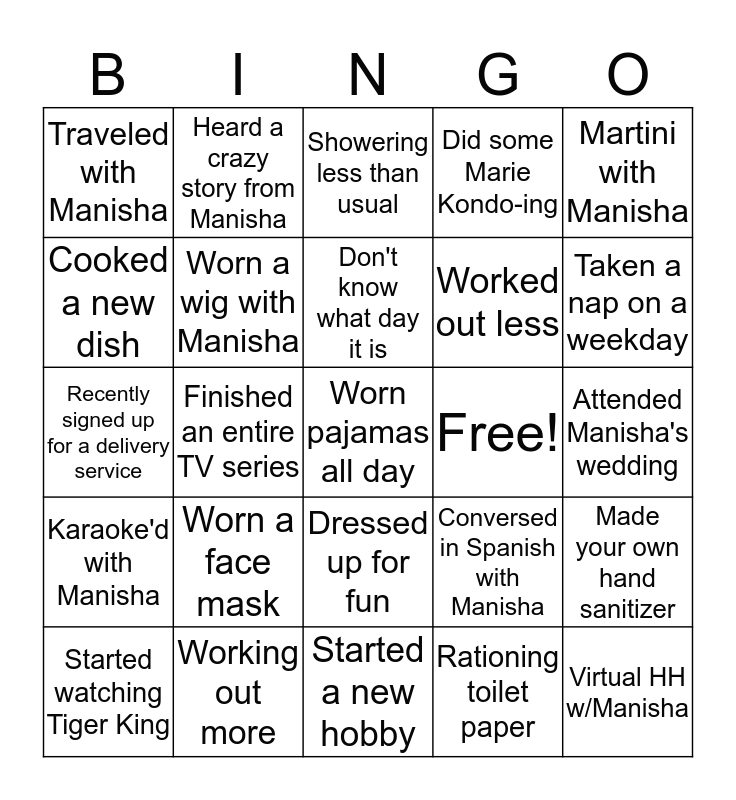 This bingo card has a free space and 30 words: Working out more, Manisha told you she's writing a letter, Finished an entire TV series, Recently started using Zoom, Traveled with Manisha, Showering less than usual, Worn a wig with Manisha, Dressed up for fun, Free!, Started a new hobby, Attended Manisha's wedding, Virtual HH w/Manisha, Rationing toilet paper, Had a drink before 5pm, Taken a nap on a weekday, Lived in SF @ same time, Conversed in Spanish with Manisha, Karaoke'd with Manisha, Worn a face mask, Martini with Manisha, Recently signed up for a delivery service, Filed your taxes, Heard a crazy story from Manisha, Worked out less, Cooked a new dish, Did some Marie Kondo-ing, Made your own hand sanitizer, Started watching Tiger King, Don't know what day it is and Misses watching sports.