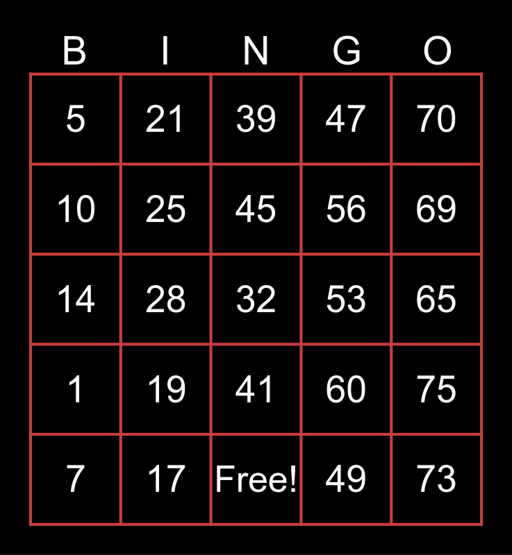 This bingo card has 25 words: 1, 17, 32, 49, 70, 5, 21, 39, 53, 75, 10, 25, Free!, 60, 69, 7, 28, 45, 56, 65, 14, 19, 41, 47 and 73.