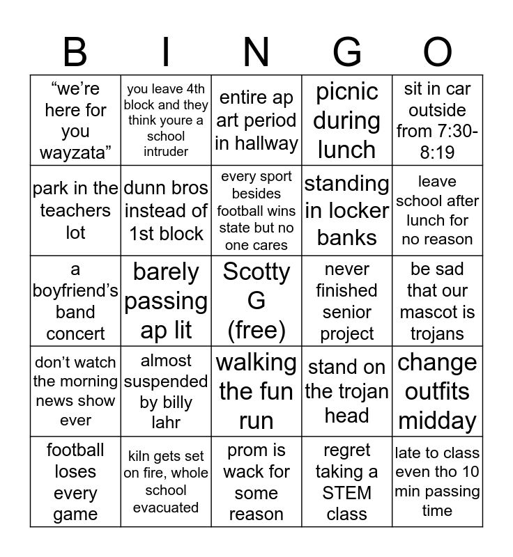 This bingo card has a free space and 24 words: football loses every game, almost suspended by billy lahr, every sport besides football wins state but no one cares, regret taking a STEM class, sit in car outside from 7:30-8:19, “we’re here for you wayzata”, you leave 4th block and they think youre a school intruder, entire ap art period in hallway, never finished senior project, be sad that our mascot is trojans, a boyfriend’s band concert, dunn bros instead of 1st block, stand on the trojan head, change outfits midday, park in the teachers lot, kiln gets set on fire, whole school evacuated, prom is wack for some reason, picnic during lunch, leave school after lunch for no reason, don’t watch the morning news show ever, barely passing ap lit, walking the fun run, standing in locker banks and late to class even tho 10 min passing time.