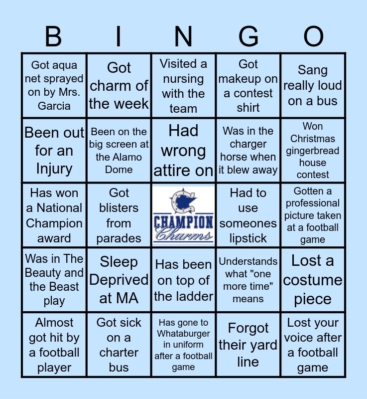 This bingo card has a free space and 24 words: Sleep Deprived at MA, Got sick on a charter bus, Had wrong attire on, Almost got hit by a football player, Sang really loud on a bus, Got aqua net sprayed on by Mrs. Garcia, Been out for an Injury, Got charm of the week, Had to use someones lipstick, Has been on top of the ladder, Was in the charger horse when it blew away, Has won a National Champion award, Understands what "one more time" means, Lost a costume piece, Been on the big screen at the Alamo Dome, Forgot their yard line, Gotten a professional picture taken at a football game, Visited a nursing with the team, Won Christmas gingerbread house contest, Got blisters from parades, Lost your voice after a football game, Was in The Beauty and the Beast play, Got makeup on a contest shirt and Has gone to Whataburger in uniform after a football game.